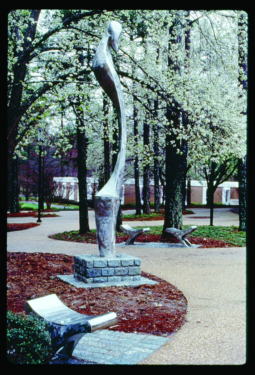 Public Art Commission for the campus of Clayton College and State University, Morrow, Georgia Commisioned by the Clayton College and State University Art Department 1997 Stainless Steel 14'h x 3'w x 4'd 3 seats: 20"h x 30"l x 14"w Stainless Steel